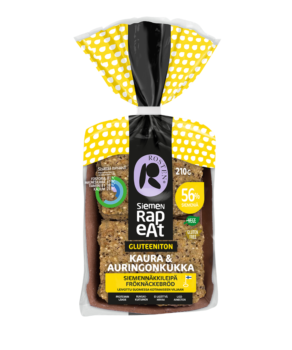 Rosteni kaera- ja päevalilleseemnetega näkileib on kvaliteetne, gluteenivaba ja maitsev vahepala, mis ühendab kaera kiudainerikkuse ja päevalilleseemnete toiteväärtuse.