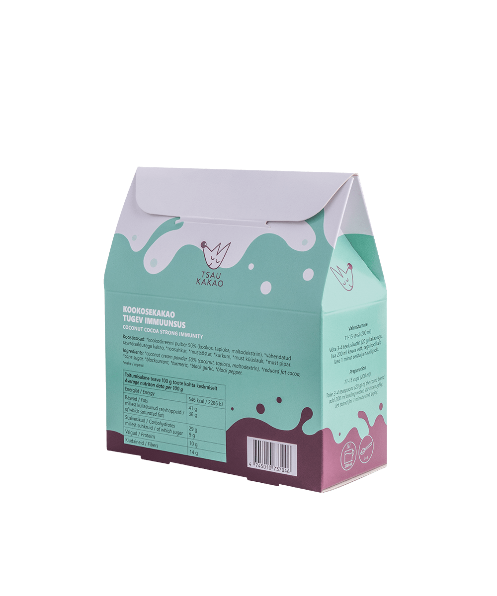 Immuunsuse kakao on kookosekreemiga veganjook, millele on lisatud mustsõstart, kurkumit ja mustat küüslauku – tuntud oma tervist toetavate ja antioksüdantsete omaduste poolest.